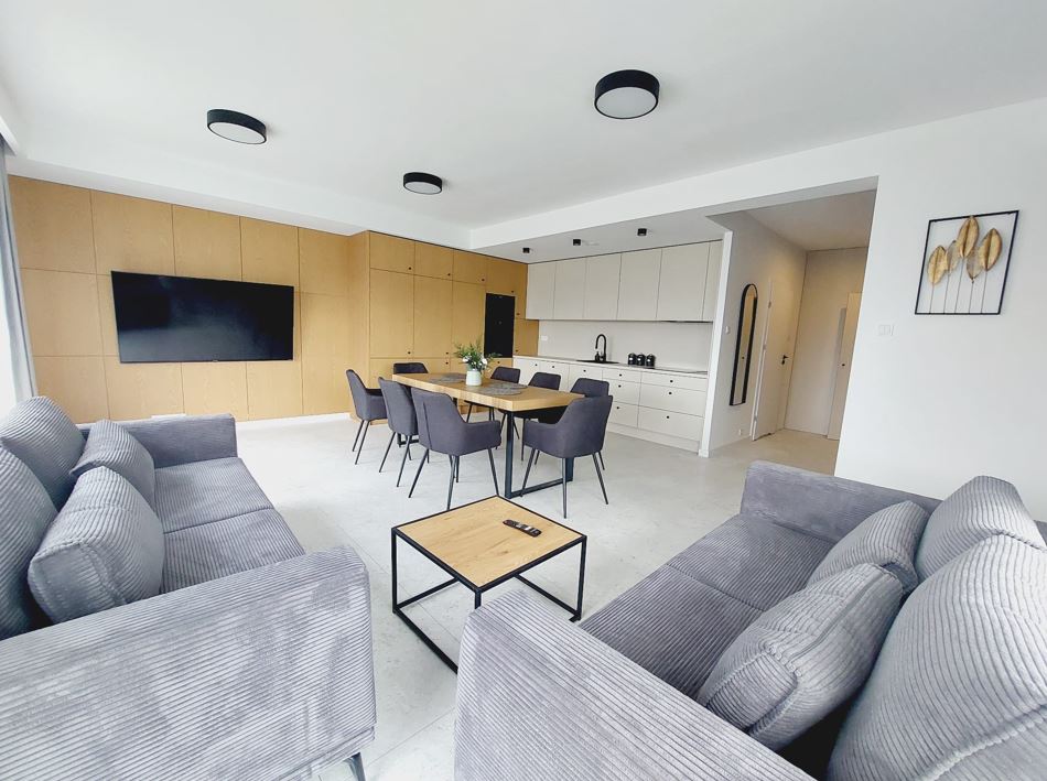 Stylowy apartament na wynajem w Krakowie – salon z aneksem kuchennym, AWG Apartments
